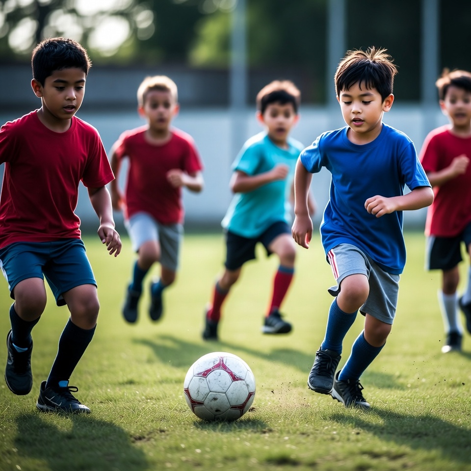 A group of young Asian boys in red and blue jerseys runs on a grassy soccer field chasing a white soccer ball. They wear athletic shorts, socks, and cleats, with some holding hands in motion. The scene is set outdoors with a blurred fence and goal in the background under natural light.