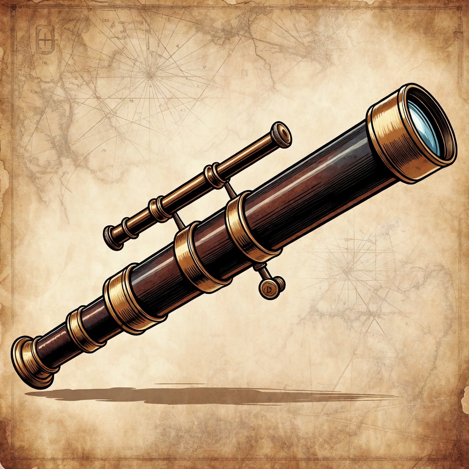 A detailed illustration of a vintage brass telescope with multiple extendable sections and wooden accents. It features gold trim and brass fittings on a textured parchment background with subtle nautical map elements. The telescope is angled diagonally, casting a soft shadow.