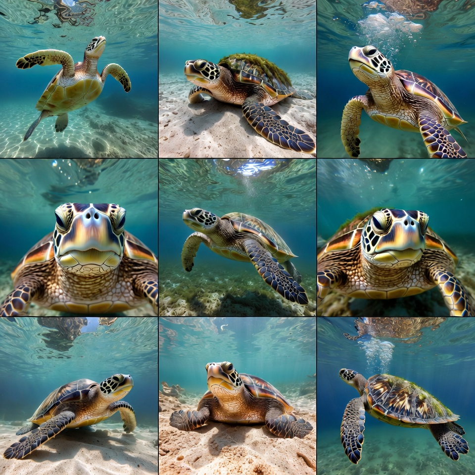 animal portrait, aquatic animal, bubbles, chelonia mydas, collage, coral reef, detailed shell, endangered species, flippers, green turtle, grid layout, marine life, multiple turtles, nature photo, ocean, ocean floor, sandy bottom, sea creature, swimming turtle, turquoise water, turtle eyes, turtle shell, underwater, wildlife photography, sea turtle