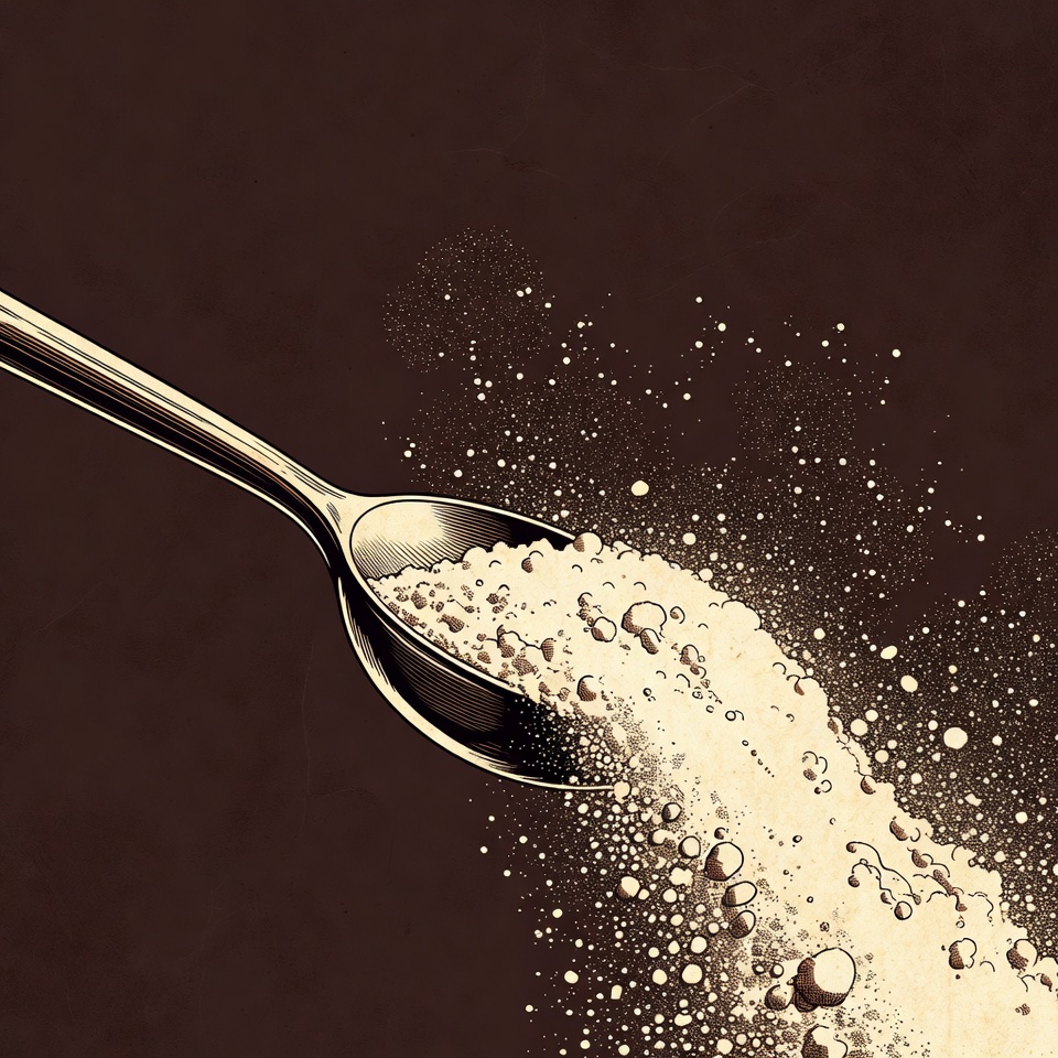 A metallic spoon pours white flour in a steady stream against a dark brown background. Fine flour particles scatter in the air, creating a dynamic pouring effect. The illustration features detailed line art with a vintage style.