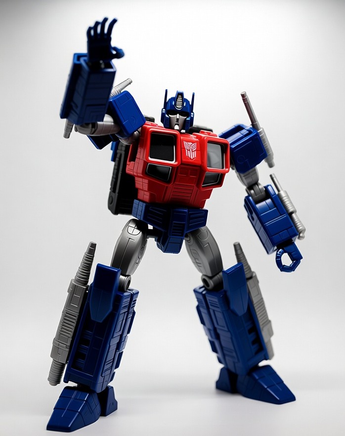 Autobot, G1, Transformer, Transformers toy, action figure, blue robot, collectible, dynamic pose, figure, leader, metallic, pose, raised arm, red chest, robot, sci-fi, toy, truck robot, white background, Optimus Prime