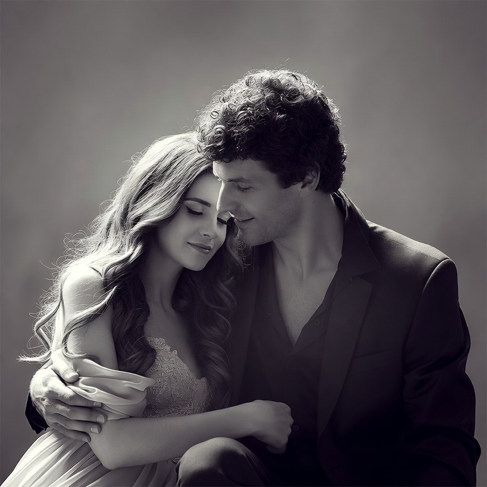 A man and woman share an intimate embrace in a black and white photograph. The woman with long wavy hair wears a lace off-shoulder dress, while the man in a suit jacket holds her tenderly. Their faces are close together with soft smiles.