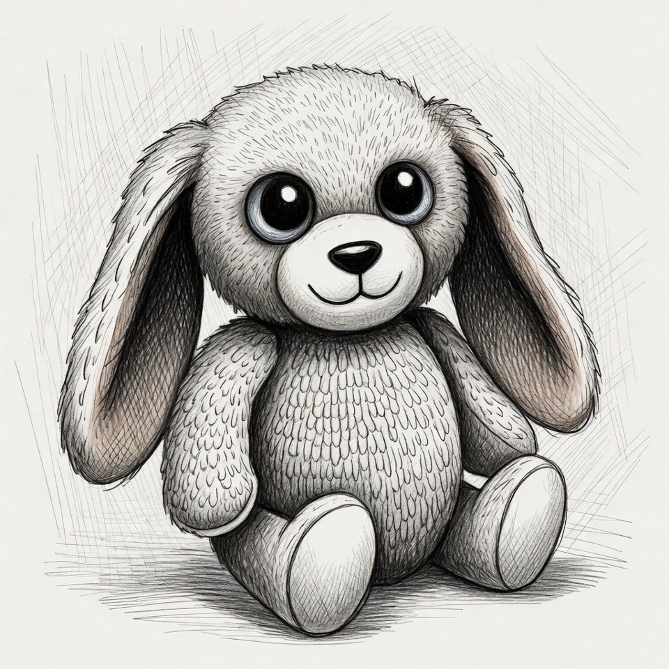 A detailed sketch illustration of a fluffy stuffed bunny with large expressive blue eyes and long floppy ears. The bunny sits on a plain background with soft fur texture and a gentle smile. Its paws are positioned cutely in front.