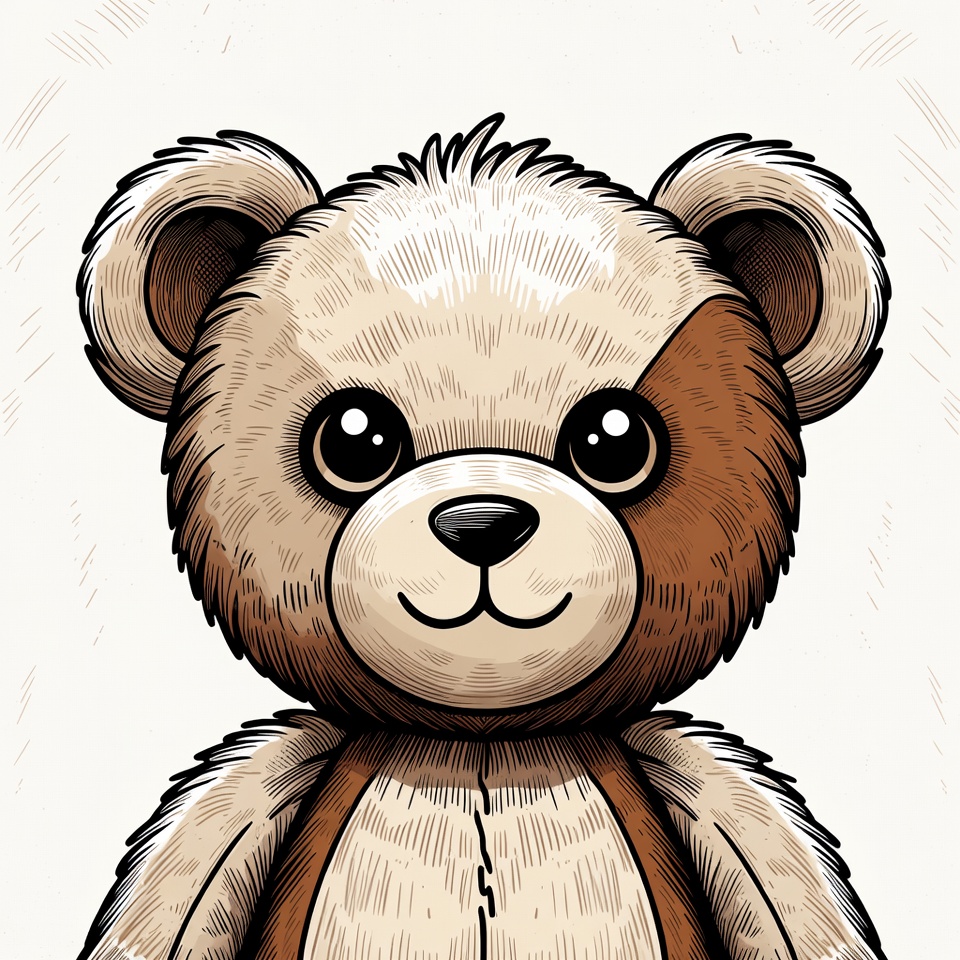 A hand-drawn illustration of a cute teddy bear with light brown and tan fur faces forward on a white background. The bear has large, expressive black eyes, a small black nose, and a friendly smile. Its fluffy fur texture is detailed with sketch lines.