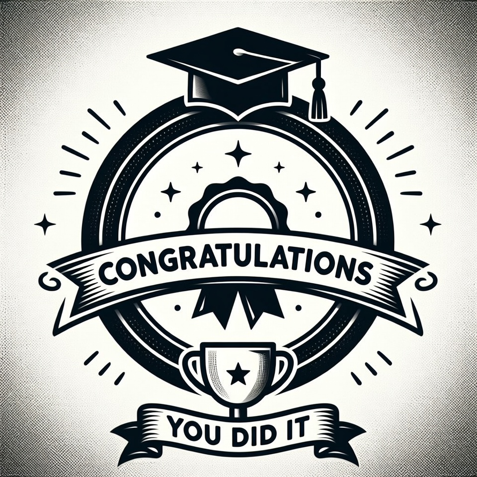 achievement, black white, celebration, clipart, congratulations banner, design, emblem, flourishes, graduate, illustration, isolated background, mortarboard, stars, trophy, vector art, you did it, graduation cap