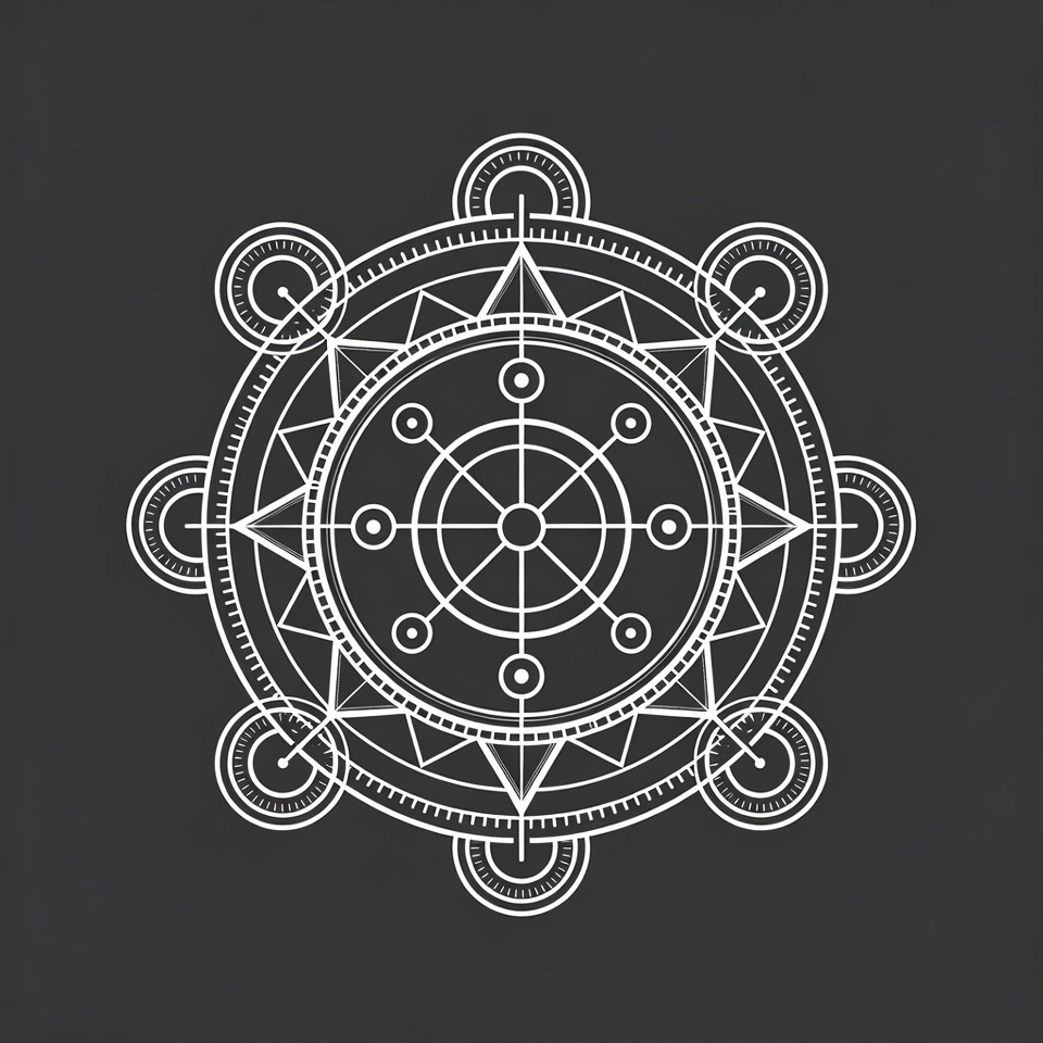 arcane glyph, black background, circular pattern, diagram, esoteric design, geometric symbol, hexfoil, illustration, mandala, mystic emblem, occult symbol, rune, sacred geometry, sigil, spiritual icon, star symbol, symmetry, vector art, white line art, hexagram