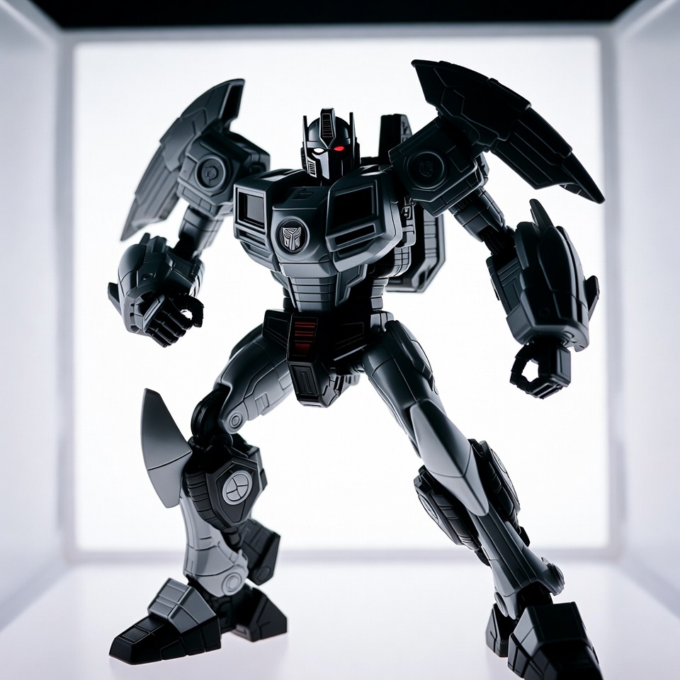 Autobot, Autobot logo, Transformers, action figure, black robot, collectible, dynamic pose, gray robot, isolated background, mecha, red eyes, robot, sci-fi, studio shot, toy figure, white background, wings, Optimus Prime