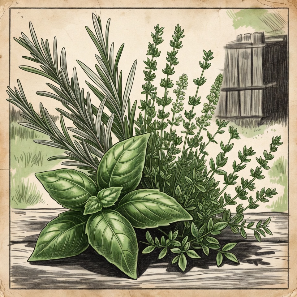 A detailed illustration features a bouquet of fresh herbs including rosemary, basil, and lavender on a wooden surface. The herbs have vibrant green leaves with woody stems and are arranged in a rustic bunch. A faded wooden fence appears in the blurred background, framed by an aged beige border.