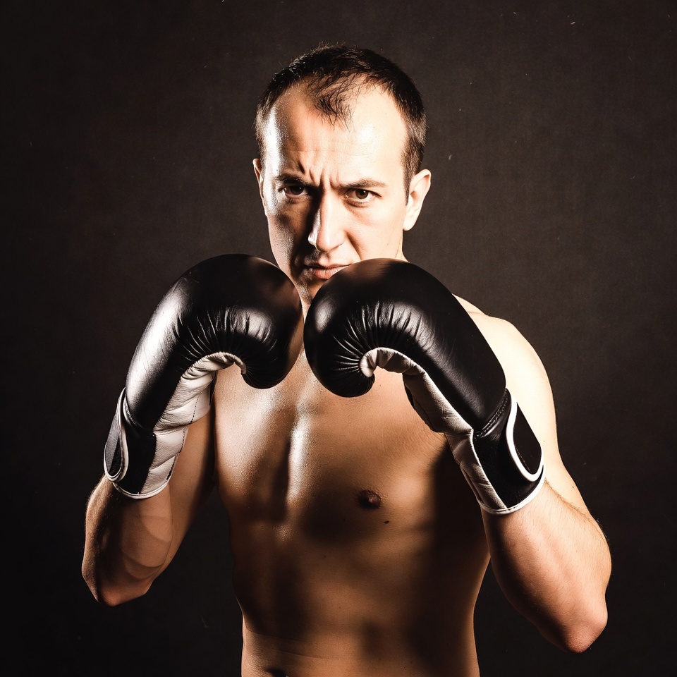 A shirtless man with short hair stands in a boxing stance wearing black boxing gloves on a dark background. His gloves are raised in a defensive guard position near his face. He has a focused expression with muscular arms visible.