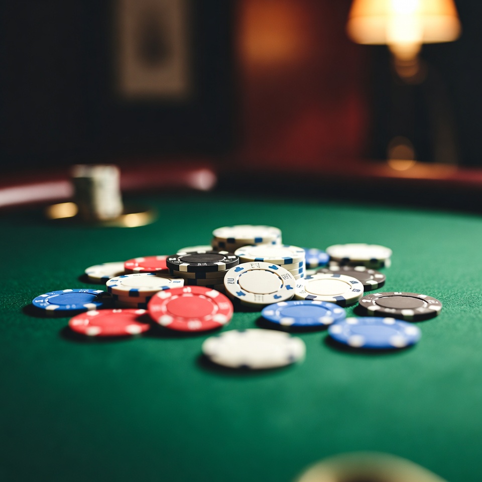 A stack of colorful poker chips in red, blue, white, and black sits on a green felt poker table. The chips are scattered slightly around a central pile, with a blurred casino background featuring warm lamps and wooden panels. The image has a bokeh effect emphasizing the chips.