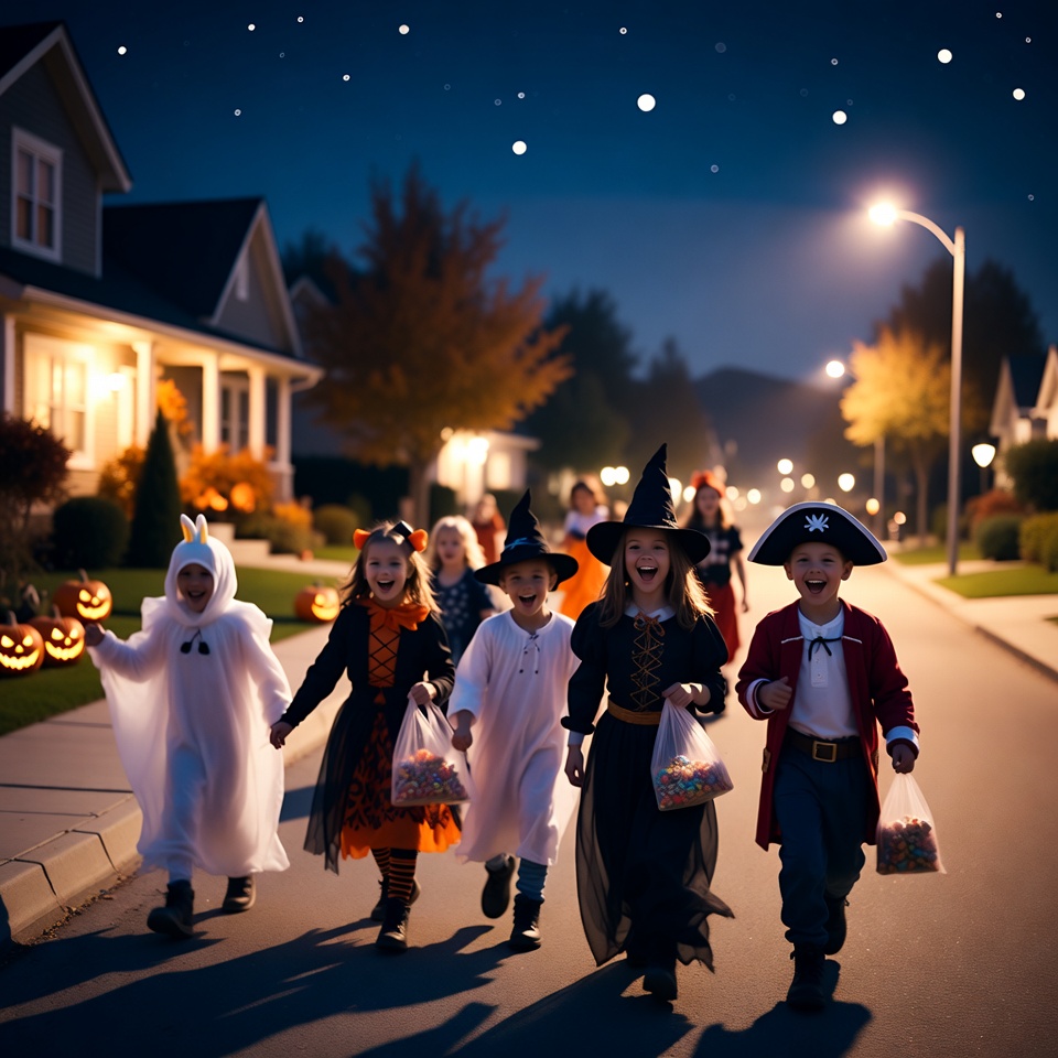 A group of children in Halloween costumes including ghosts, witches, and a pirate walks down a neighborhood street at night collecting candy. They carry bags filled with treats under streetlights and starry skies, with houses decorated with pumpkins in the background. The kids are excitedly moving together on the sidewalk.