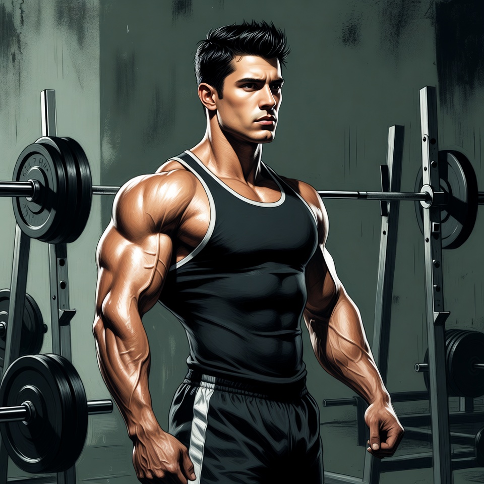 White, abs, athletic build, barbells, biceps, black clothing, bodybuilder, chest muscles, dark hair, dim lighting, fitness, gym, illustration, industrial gym, male, physique, shorts, standing pose, strong man, tank top, weight rack, weights, workout, muscular man