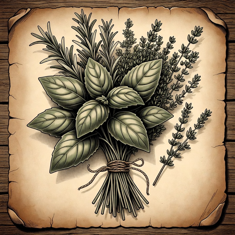 An illustration of fresh herbs including rosemary, basil, and lavender bundled together with twine. The bouquet is placed on a textured parchment paper background with curled edges. Detailed line art style emphasizes the leaves and stems.