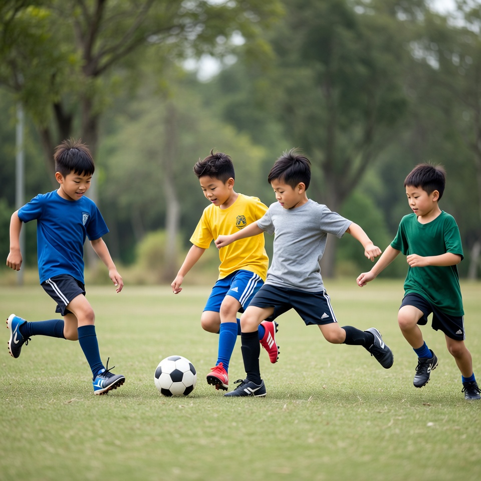 Five young Asian boys in colorful soccer uniforms kick a black-and-white soccer ball on a green grassy field. They wear jerseys in blue, yellow, gray, and green with matching shorts and socks, running dynamically amidst tall trees in the background. The boys are engaged in active play under an outdoor park setting.