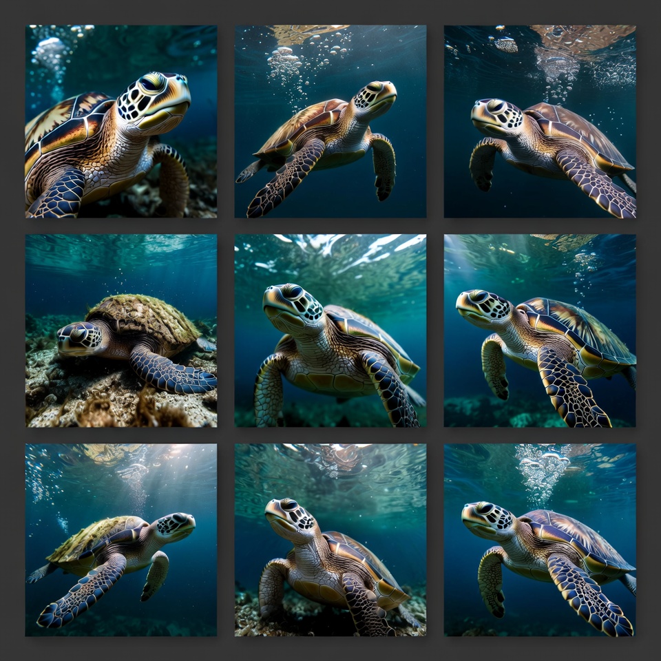 A 3x3 grid of underwater photographs features multiple green sea turtles swimming in clear blue ocean waters. The turtles display detailed colorful shells and patterns, with sunlight rays and bubbles visible in some images. They are positioned dynamically against coral and open water backgrounds.
