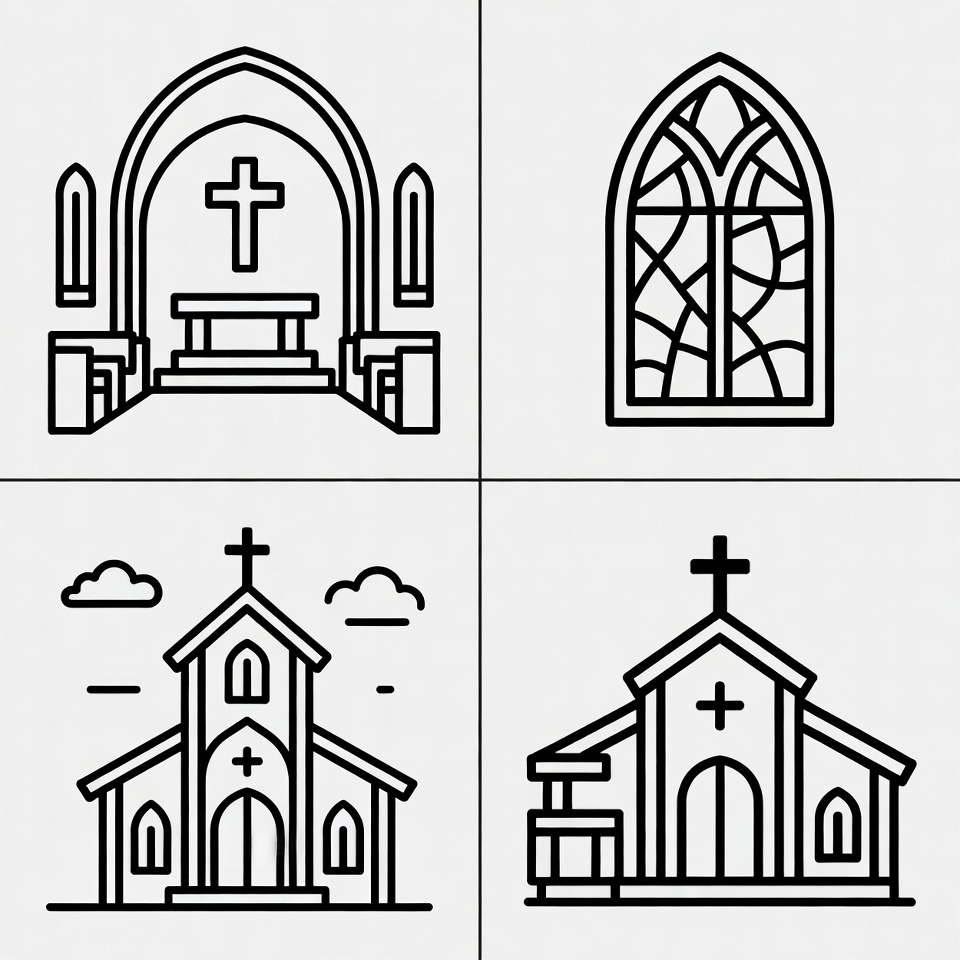 A set of four black line art illustrations depicts churches and architectural elements. The top left shows an arched church interior with a cross and altar, the top right features a gothic stained glass window, the bottom left portrays a church with a steeple and clouds, and the bottom right illustrates a church with a side entrance and porch.