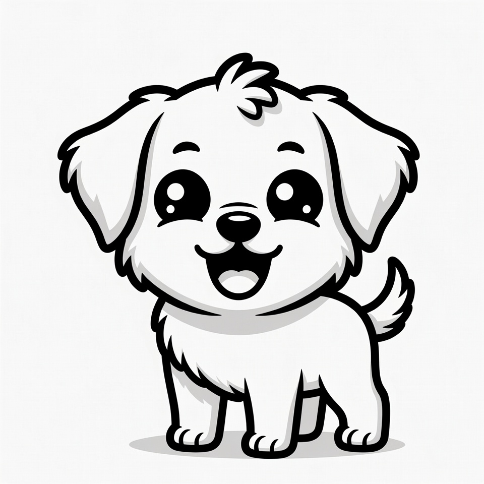 adorable puppy, big eyes, black and white, cartoon animal, cartoon dog, chibi dog, cute animal, dog clipart, dog drawing, fluffy dog, fluffy fur, happy dog, isolated background, kawaii art, kawaii puppy, line art, puppy art, puppy eyes, puppy face, puppy illustration, puppy smile, smiling puppy, standing puppy, vector puppy, cute puppy