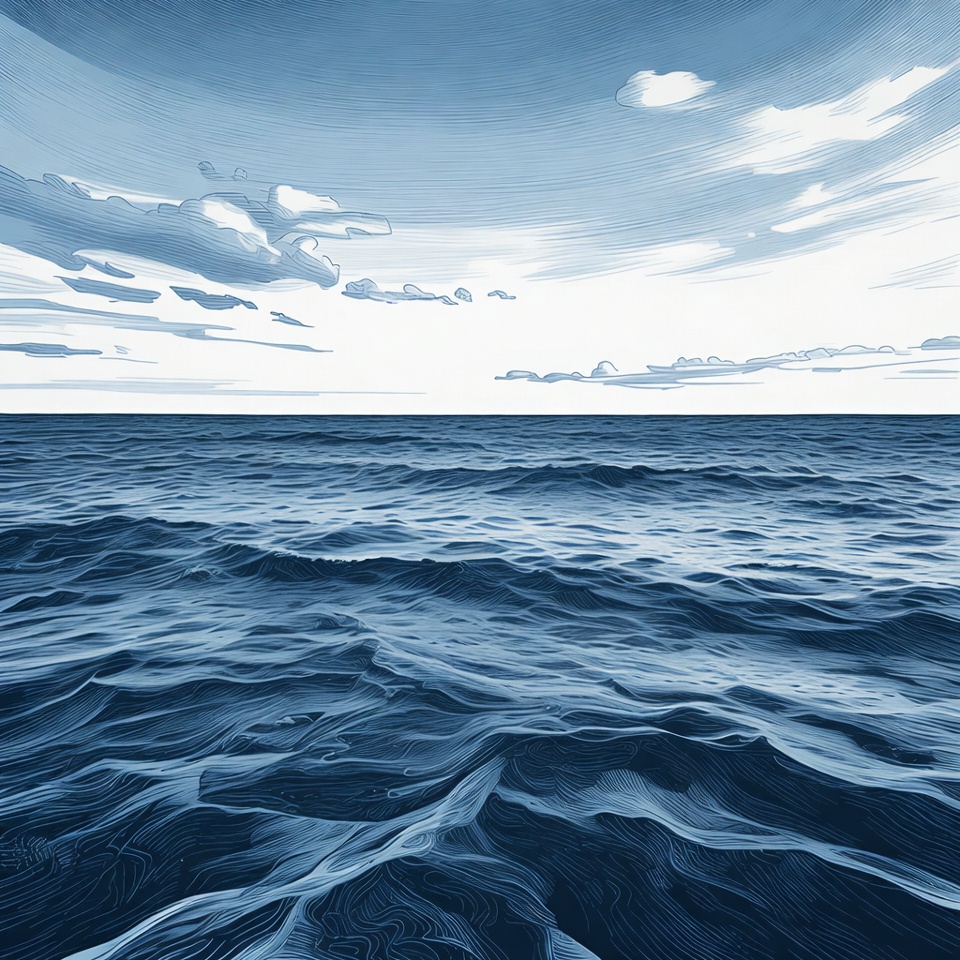 A digital illustration depicts a vast ocean with turbulent blue waves extending to the horizon. Above, a cloudy sky in shades of blue and white creates a dramatic atmosphere. The artwork features smooth, sketch-like lines emphasizing the movement of water and clouds.