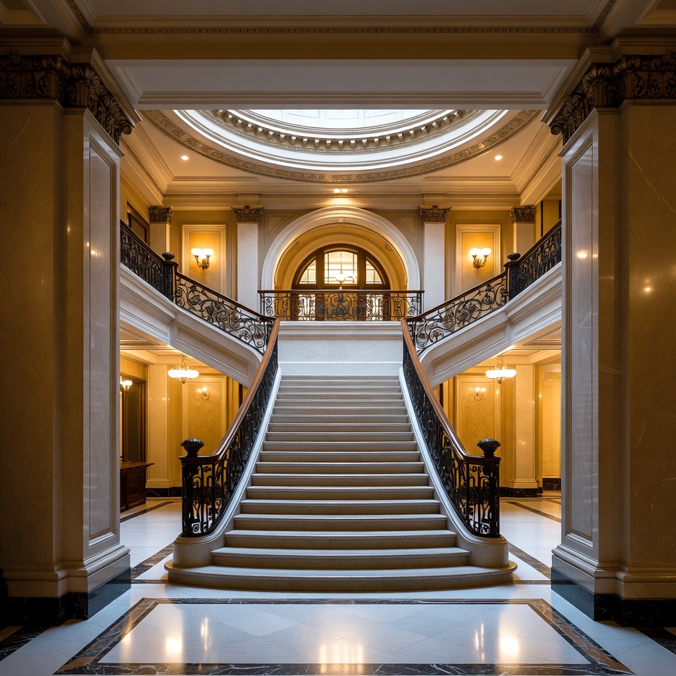 Corinthian columns, arched window, architecture, ballroom stairs, chandelier lighting, classical architecture, domed atrium, double staircase, elegant hall, grand hall, historic interior, hotel lobby, interior design, luxury interior, mansion staircase, marble floor, marble stairs, opulent building, ornate railings, palace staircase, skylight, symmetric stairs, wall lamps, wrought iron, grand staircase