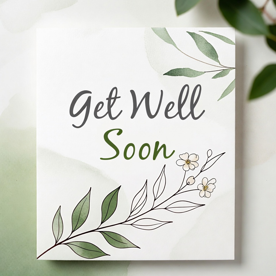 A white greeting card features 'Get Well Soon' in elegant green and gray text. It is decorated with watercolor-style green leaves and small white flowers on both sides. The design has a soft, watercolor background in light green tones.