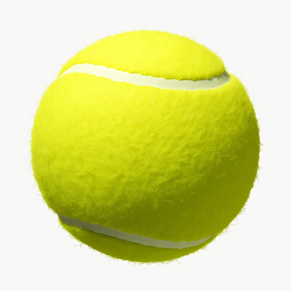 A bright yellow tennis ball with a white curved seam is centered against a plain white background. The ball has a fuzzy texture and is isolated for clear visibility.