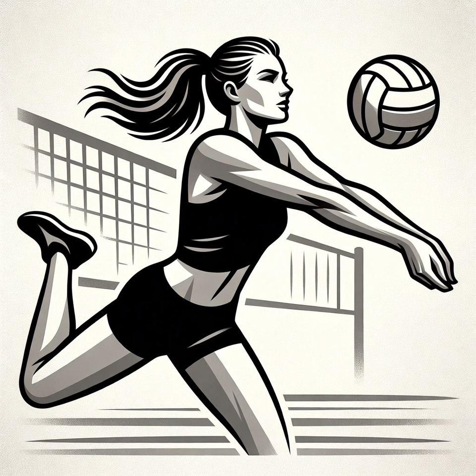 A black and white illustration depicts a woman with a ponytail leaping to spike a volleyball over the net. She wears a sports bra, shorts, and sneakers, with dynamic motion lines emphasizing her athletic pose. The volleyball court net and floor are visible in the background.