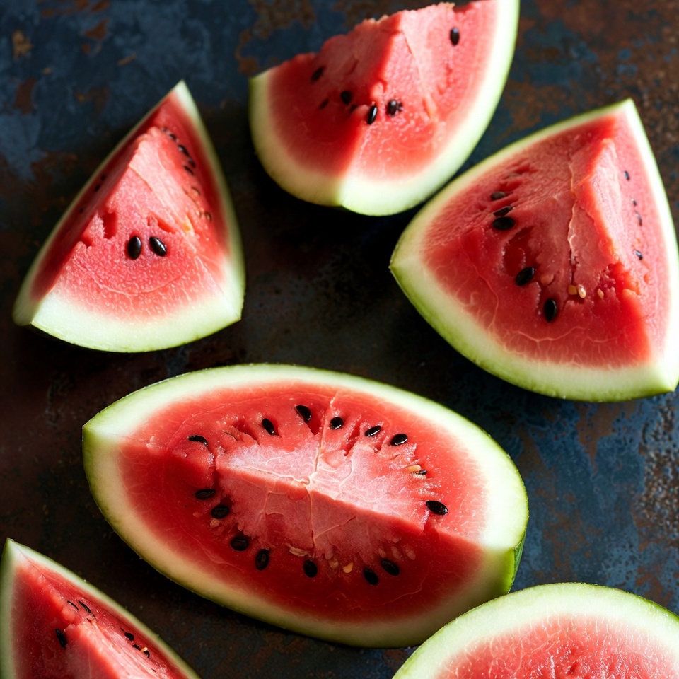 angled slices, black seeds, food photography, fresh fruit, fresh produce, fruit closeup, fruit slices, green rind, juicy watermelon, metal surface, red watermelon, rustic background, seedless parts, sliced watermelon, summer fruit, tropical fruit, vibrant colors, watermelon cut, watermelon slices, watermelon