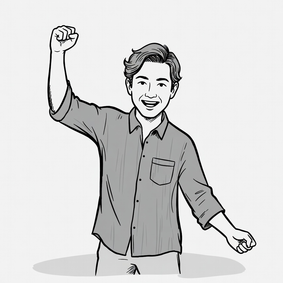 A line-drawn illustration of a young Asian man with short wavy hair celebrates with both fists raised triumphantly. He wears a collared shirt with rolled sleeves and stands on a plain isolated background. His face shows a wide smile and energetic pose.