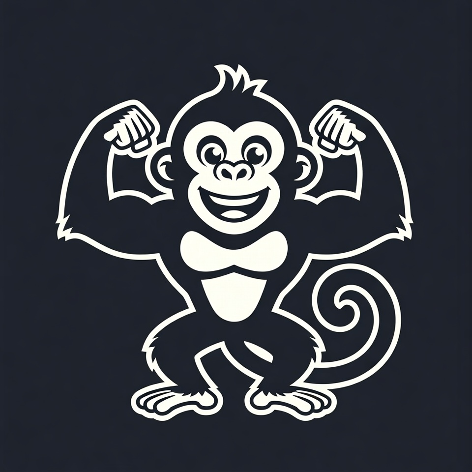 A black and white illustration of a cartoon monkey flexing its muscular arms with a big smile. The monkey stands on two legs with a curly tail, posed dynamically on a dark background. Bold white outlines emphasize its strong biceps and cheerful expression.