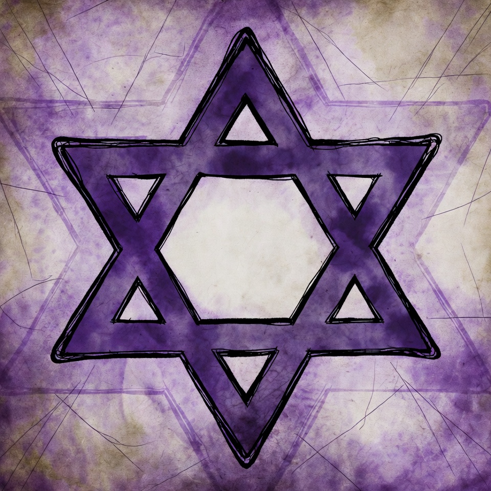 A vibrant purple Star of David is illustrated with bold black outlines on a textured beige and purple background. The six-pointed star features watercolor-style shading in shades of purple. Subtle cracks and aged paper effects enhance the artistic design.