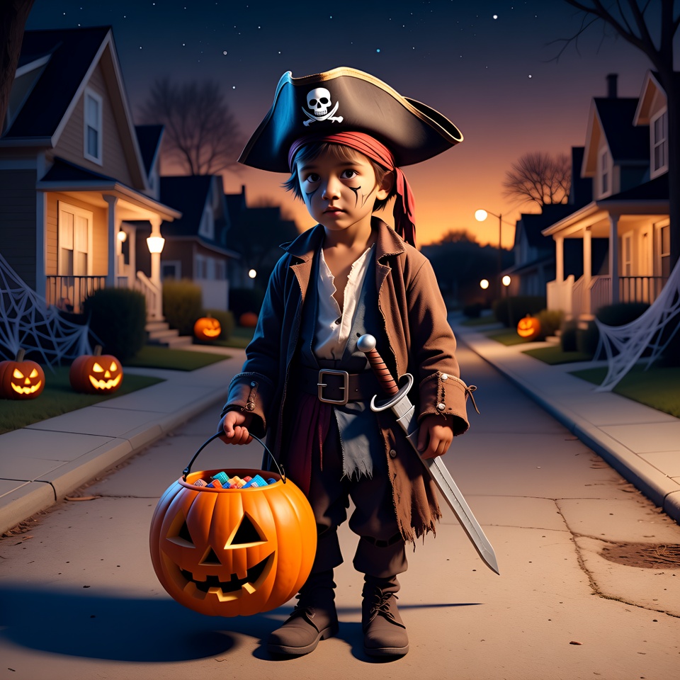 A young boy dressed as a pirate with a tricorn hat, eye patch, and sword stands on a neighborhood street at dusk. He holds a large orange pumpkin-shaped candy bucket filled with treats. Pumpkins, cobwebs, and lit houses with Halloween decorations line the sidewalk behind him.