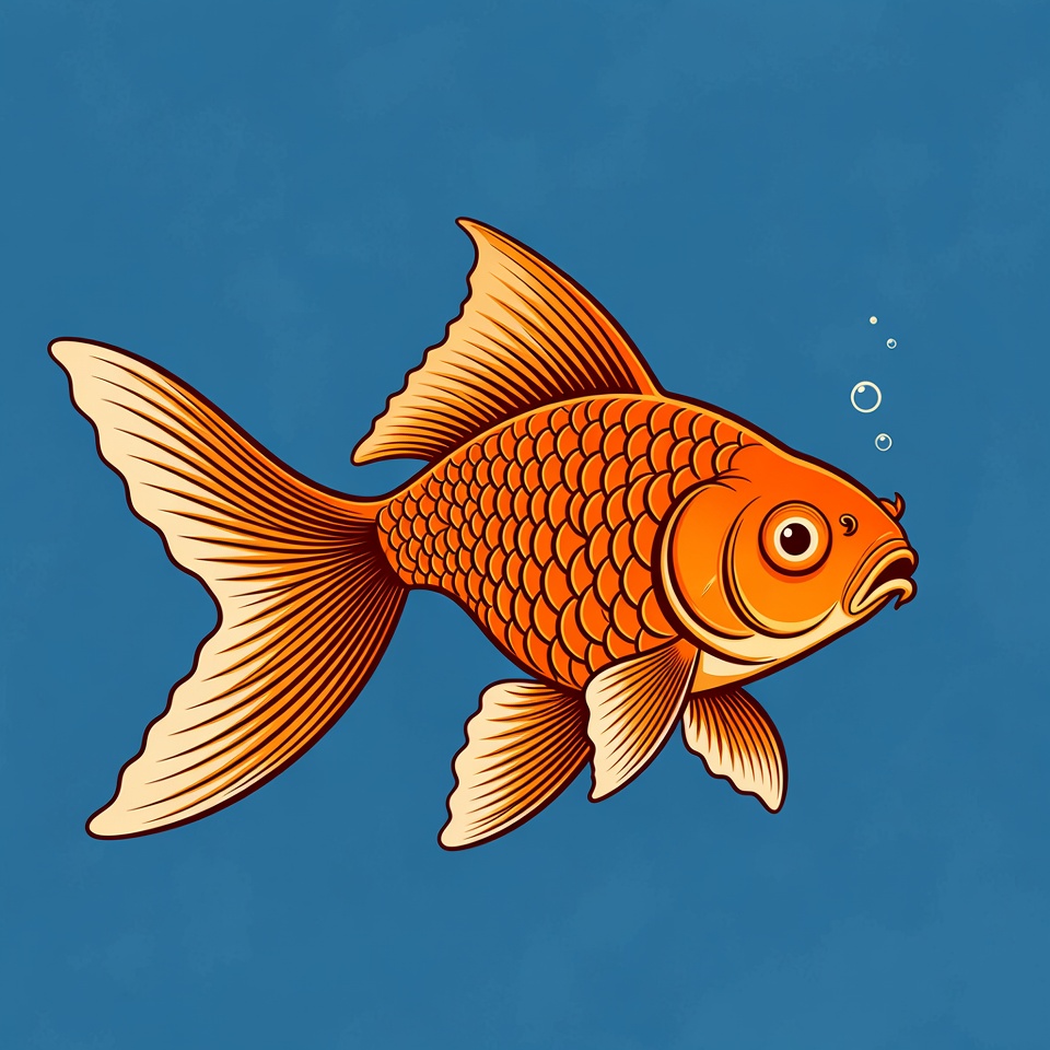 A vibrant orange goldfish with detailed scales swims against a solid blue background. It features flowing fins, large expressive eyes, and bubbles rising nearby. The illustration style emphasizes bold outlines and smooth shading.