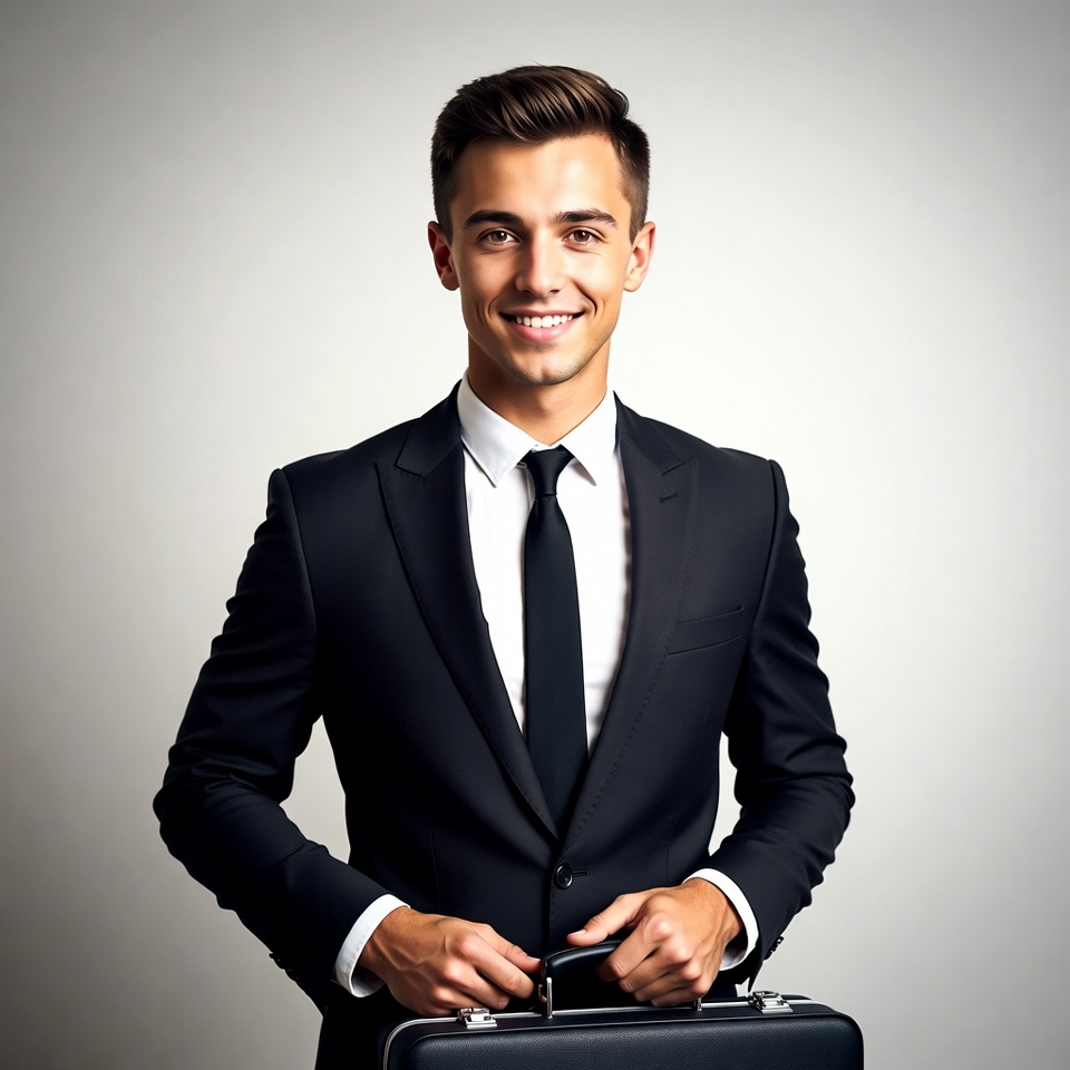 A young man with short dark hair smiles confidently at the camera while standing against a plain gray background. He wears a black suit, white dress shirt, and black tie. He holds a black briefcase with both hands in front of him.