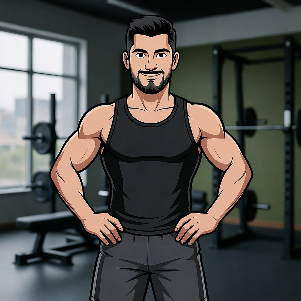 A muscular man with dark hair and a beard stands confidently in a gym, wearing a black tank top and gray shorts. He has his hands on his hips, with gym equipment like barbells and racks visible in the blurred background. The image is a cartoon illustration on an isolated background.
