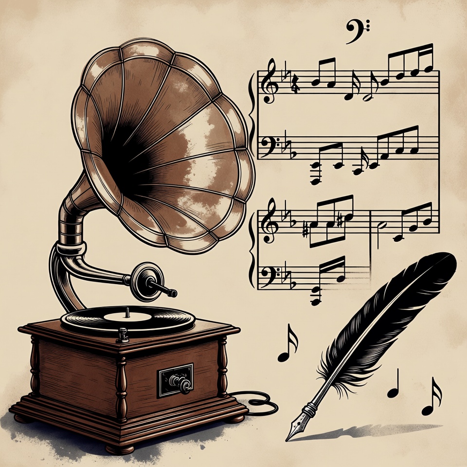 A detailed illustration of a vintage gramophone with a large horn and wooden base sits on a beige parchment background. Musical notes and staff lines float around it, accompanied by a black quill pen and feather. The artwork features a sepia-toned, vintage style with shading and highlights.