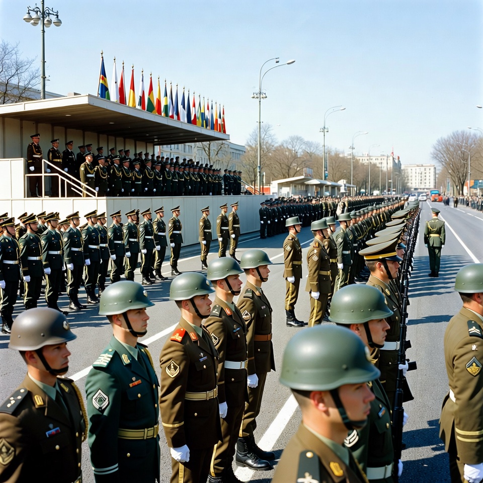 White, buildings, camouflage, city street, formation, green uniforms, helmets, international flags, men, military uniforms, officers, orange uniforms, platform, soldiers, streetlights, sunny day, military parade