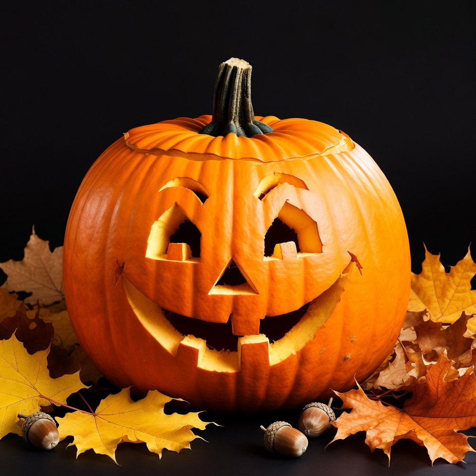 Carved Jack-o'-Lantern with Autumn Leaves