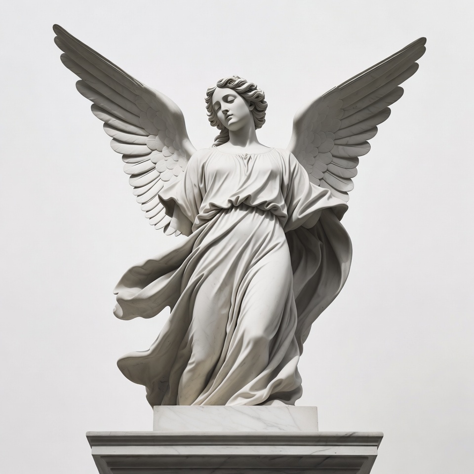 angel, classical sculpture, draped gown, female angel, flowing robes, isolated background, marble, marble statue, pedestal, sculpture, serene face, statue, white statue, winged angel, wings, wings outstretched, angel statue