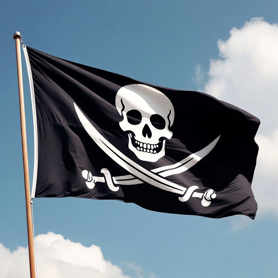 A black pirate flag with a white skull and crossed swords flies on a wooden pole against a blue sky with clouds. The skull features hollow eyes and a grinning mouth. The flag waves gently in the wind.