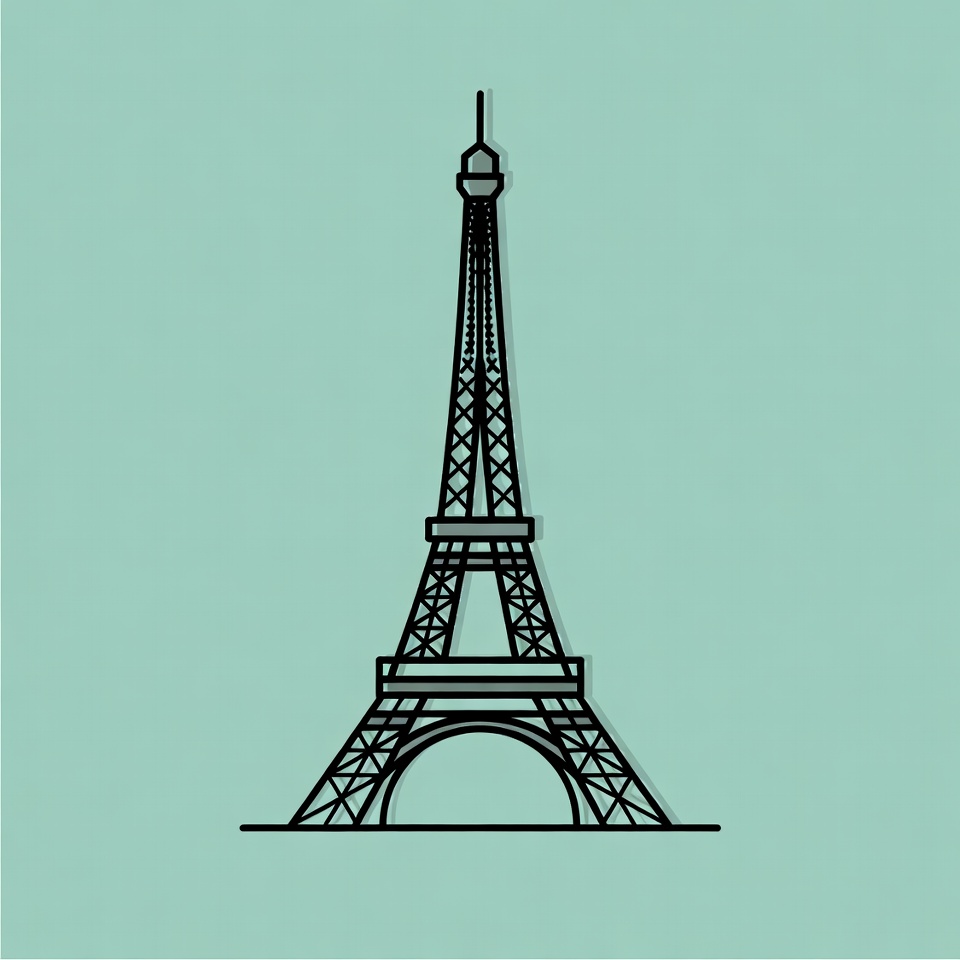 France, Paris, architecture, black outline, illustration, isolated background, landmark, line art, silhouette, simple drawing, teal background, tourist attraction, travel icon, vector, Eiffel Tower