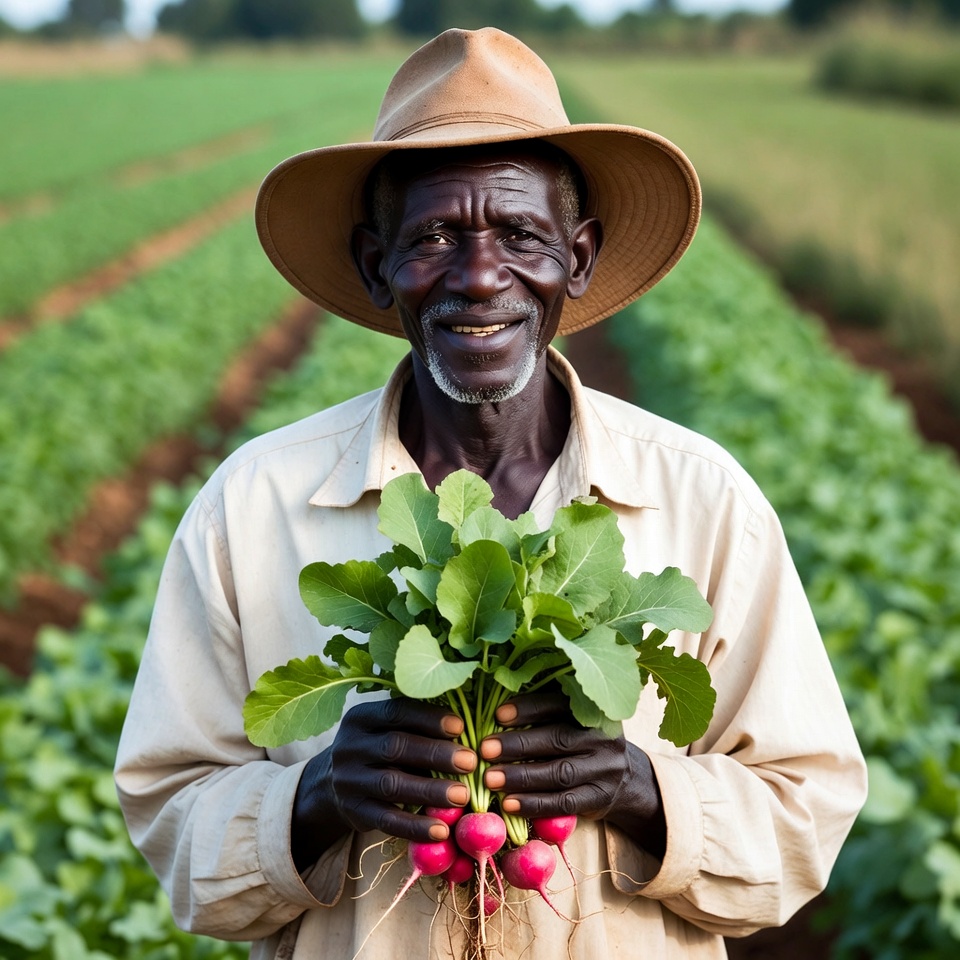 African-American, agriculture, beige hat, black man, crop rows, elderly man, farm worker, field background, fresh vegetables, green crops, green leaves, hands holding, happy face, male, outdoor farming, radish field, radishes, rural farm, smiling farmer, vegetable harvest, white shirt, African farmer