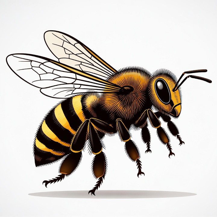 A detailed vector illustration of a honey bee in flight with yellow and black stripes. The bee has large compound eyes, transparent wings, and fuzzy body segments. It is depicted against a white isolated background.
