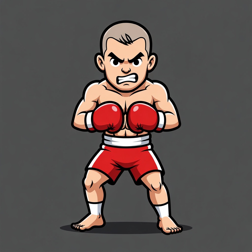 A muscular chibi-style man with a bald head and fierce expression stands in a boxing stance. He wears red boxing gloves, red shorts, and white wraps on his feet. The illustration is set against a solid gray background.