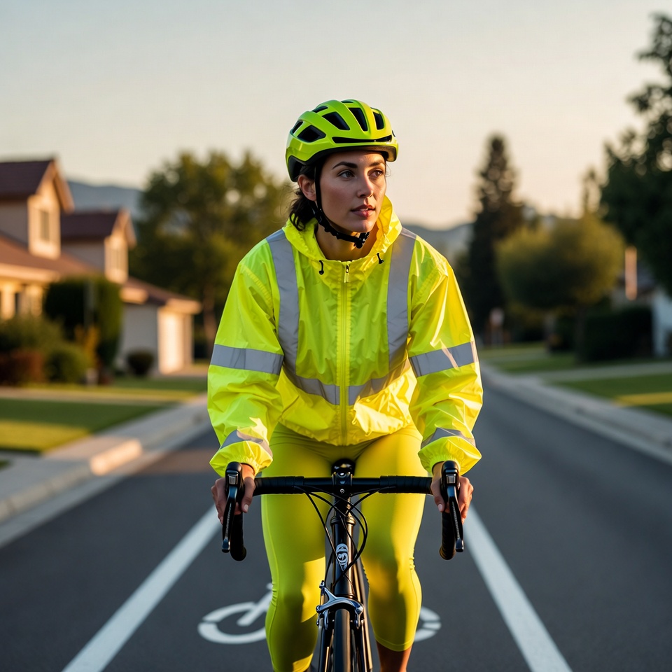 A woman wearing a bright yellow helmet, reflective jacket, and leggings rides a road bike on a suburban street. She grips the handlebars firmly while cycling on a bike lane marked with a bicycle symbol. Houses and trees line the background under a sunset sky.
