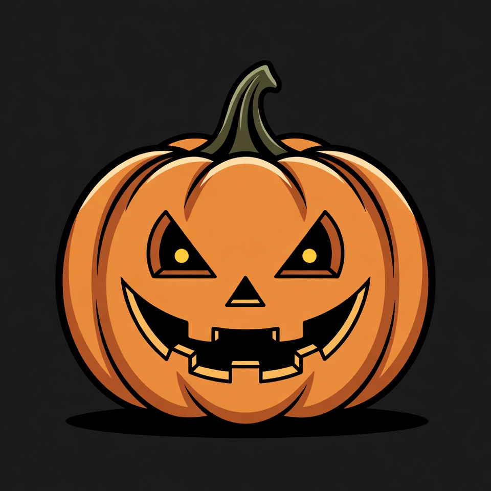 A cartoon illustration of a jack-o'-lantern pumpkin with glowing yellow eyes, triangular nose, and jagged smiling mouth. The orange pumpkin has a green stem and sits on a black isolated background. Bold black outlines emphasize its spooky Halloween design.
