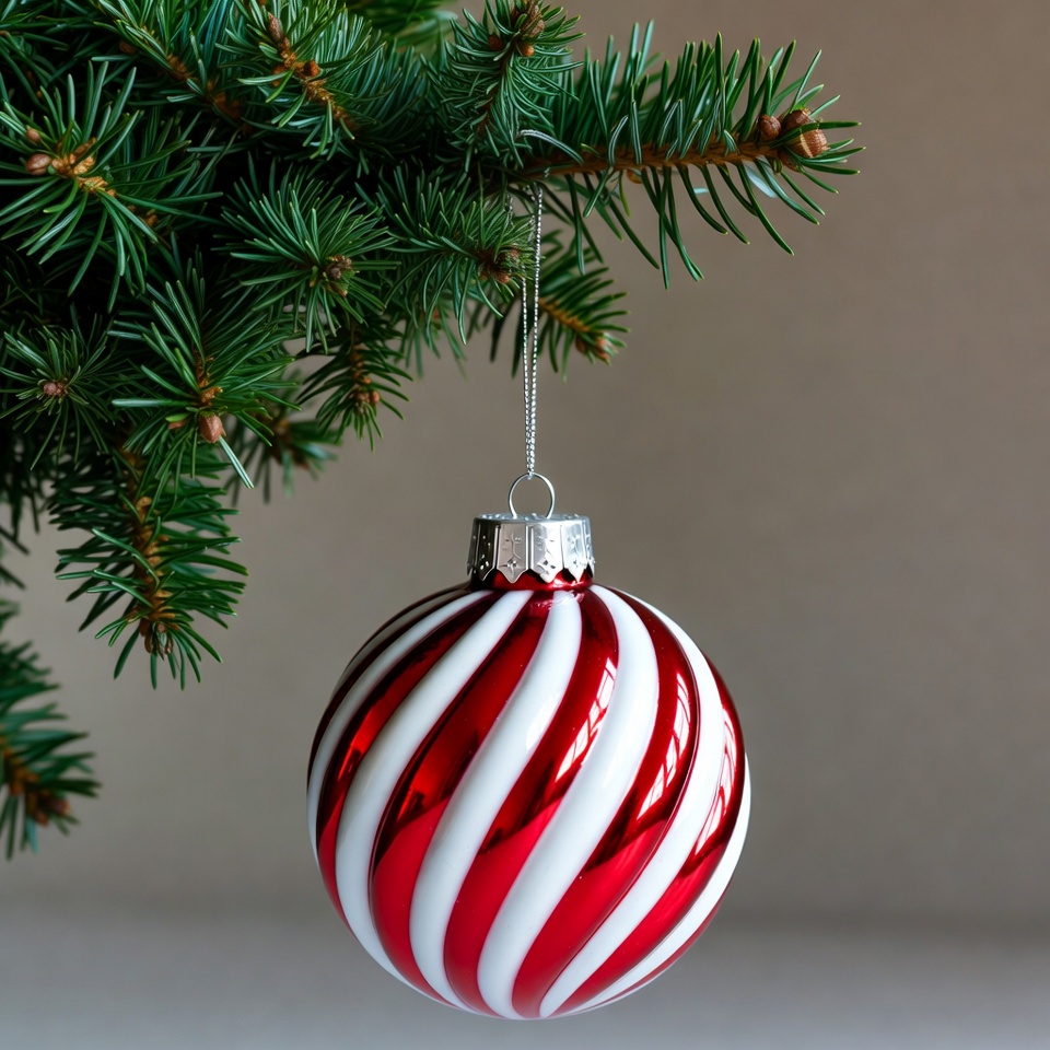 Christmas ball, Christmas decor, Christmas tree, bauble, candy cane stripes, evergreen needles, festive ornament, glossy finish, hanging ornament, holiday decoration, isolated background, pine branch, red ornament, red white stripes, shiny bauble, silver hook, striped ball, swirl pattern, white stripes, winter holiday, Christmas ornament