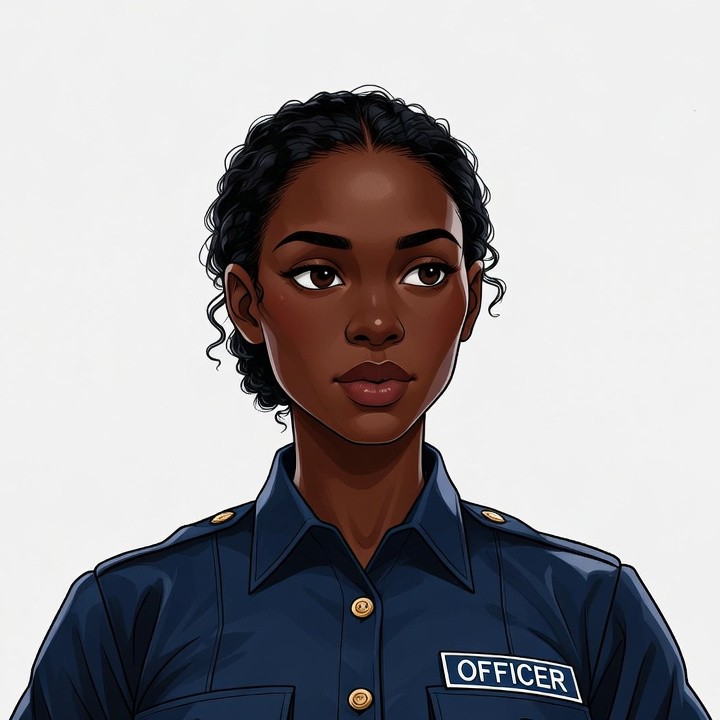 A young African-American woman with curly black hair wears a navy blue police uniform featuring gold buttons and an 'OFFICER' badge. She faces forward with a serious expression on a white background. The illustration style highlights her detailed facial features and professional attire.