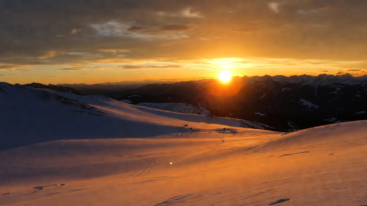 alpine scenery, clouds, cold snow, dramatic sky, golden hour, mountains, nature, orange sky, outdoors, ridges, snow, snowy peaks, sunrise, valleys, warm light, winter landscape, sunset