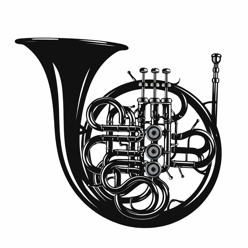 band, bell, black and white, brass instrument, classical music, clipart, horn, illustration, isolated background, music, musical instrument, orchestra, silhouette, tubing, valves, vector art, French horn