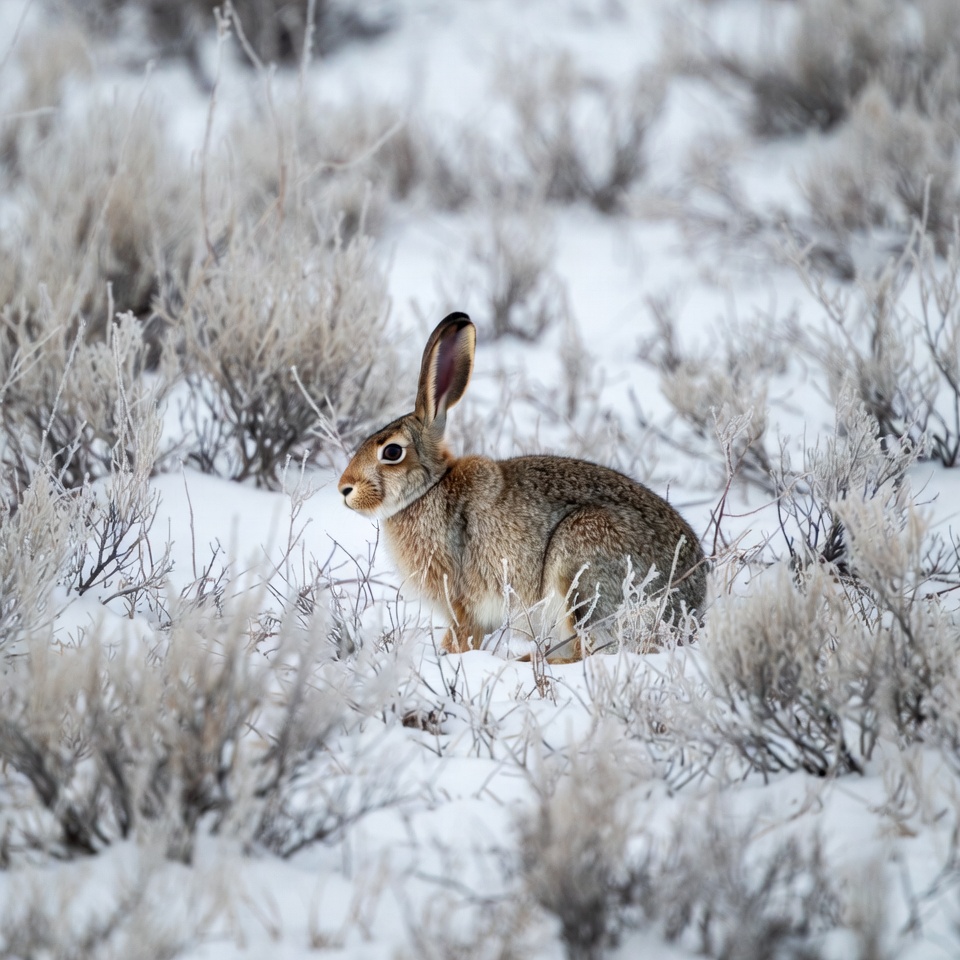 A snowshoe hare sits in a snowy landscape surrounded by frost-covered bushes. The rabbit has long black-tipped ears, grayish fur, and alert eyes. Snow blankets the ground and vegetation around it.